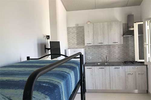 Bilocale in muratura completamente ristrutturato, dai 2 ai 4 posti letto, soggiorno con due letti singoli, angolo cottura, camera matrimoniale con aria condizionata, bagno con box doccia, veranda esterna per mangiar fuori.Dista dal mare solo 10 m.