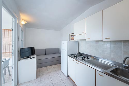 CASA MOBILE: mq 24, composto con tinello con cucina (caffettiera esclusa), divano letto a castello, camera matrimoniale, bagno con box doccia, aria condizionata, TV, cassaforte, veranda esterna.